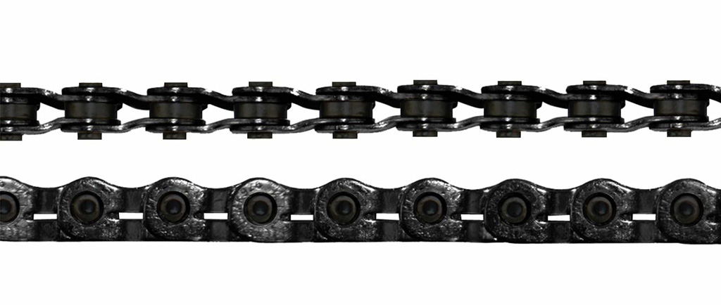 Correntes mais estreitas e com tolerâncias mínimas. Exigem alinhamento correto de gancheira, bom estado do câmbio e manutenção adequada. O desgaste é percebido mais cedo e a troca preventiva é crítica.