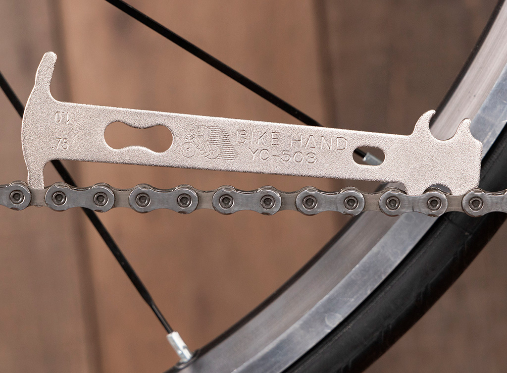 A avaliação correta deve ser feita com ferramenta específica — o medidor de desgaste de corrente. Inspeções visuais não são suficientes para determinar o momento ideal de substituição, especialmente em transmissões modernas com tolerâncias reduzidas.